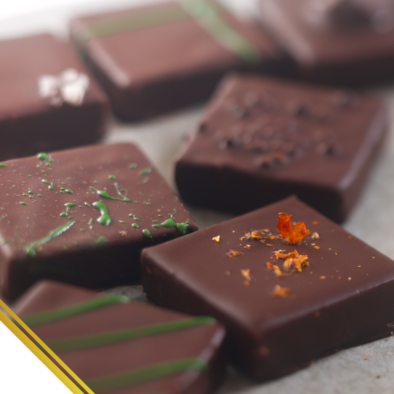 地元で育った素材と相性のよいシングルオリジンカカオを重ね、身体にやさしいおいしさを追求します。 地産地消と健康の理念を一粒の余韻に込めました。